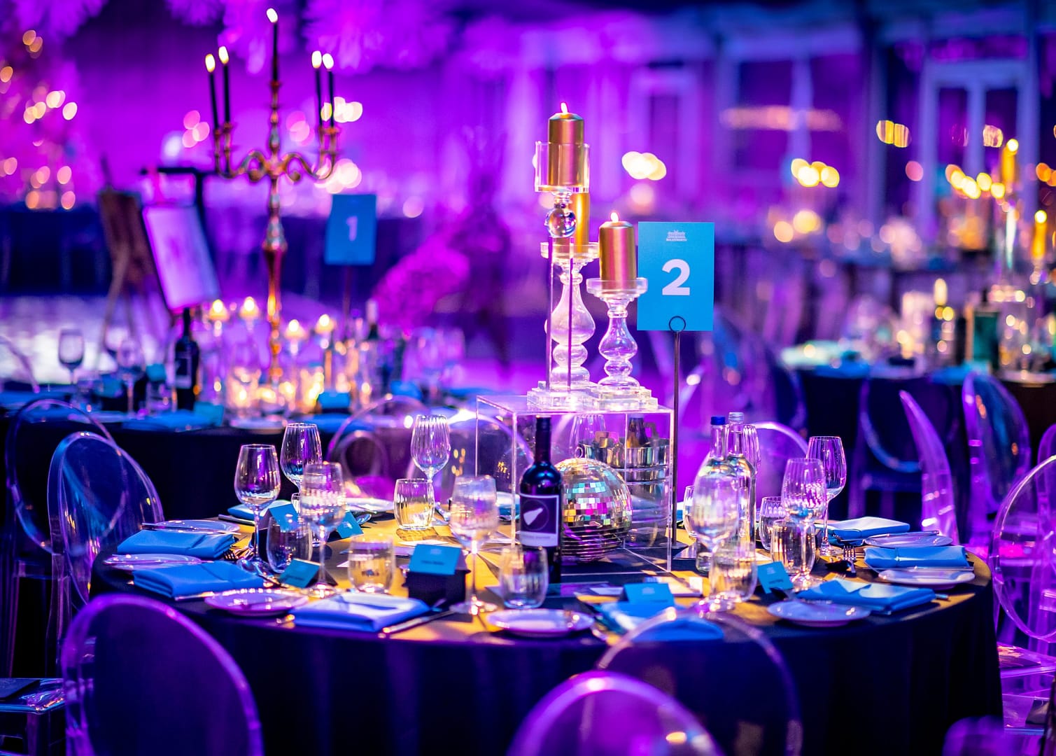 Interior of the Bolesworth hospitality marquee featuring elegant modern high tables with teal number placements, lush green plants.